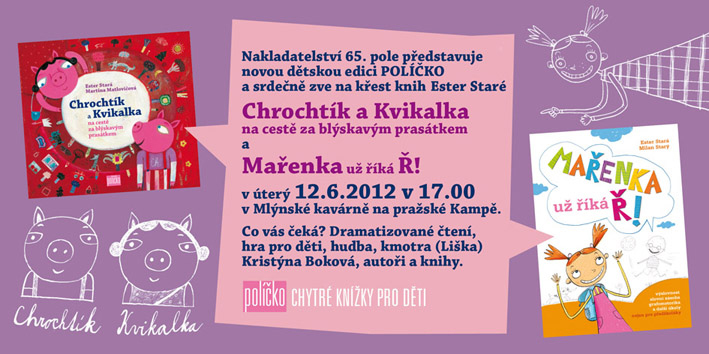 aktuality > 12.6.2012 Mlýnská kavárna - predstavení edice POLÍČKO, křest knih Mařenka už říká Ř! a Chrochtík a Kvikalka na cestě za blýskavým prasátkem